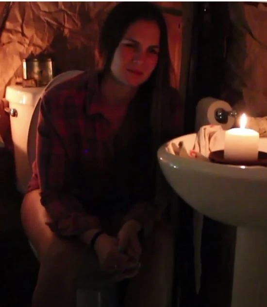 A woman farting on a toilet during defecation